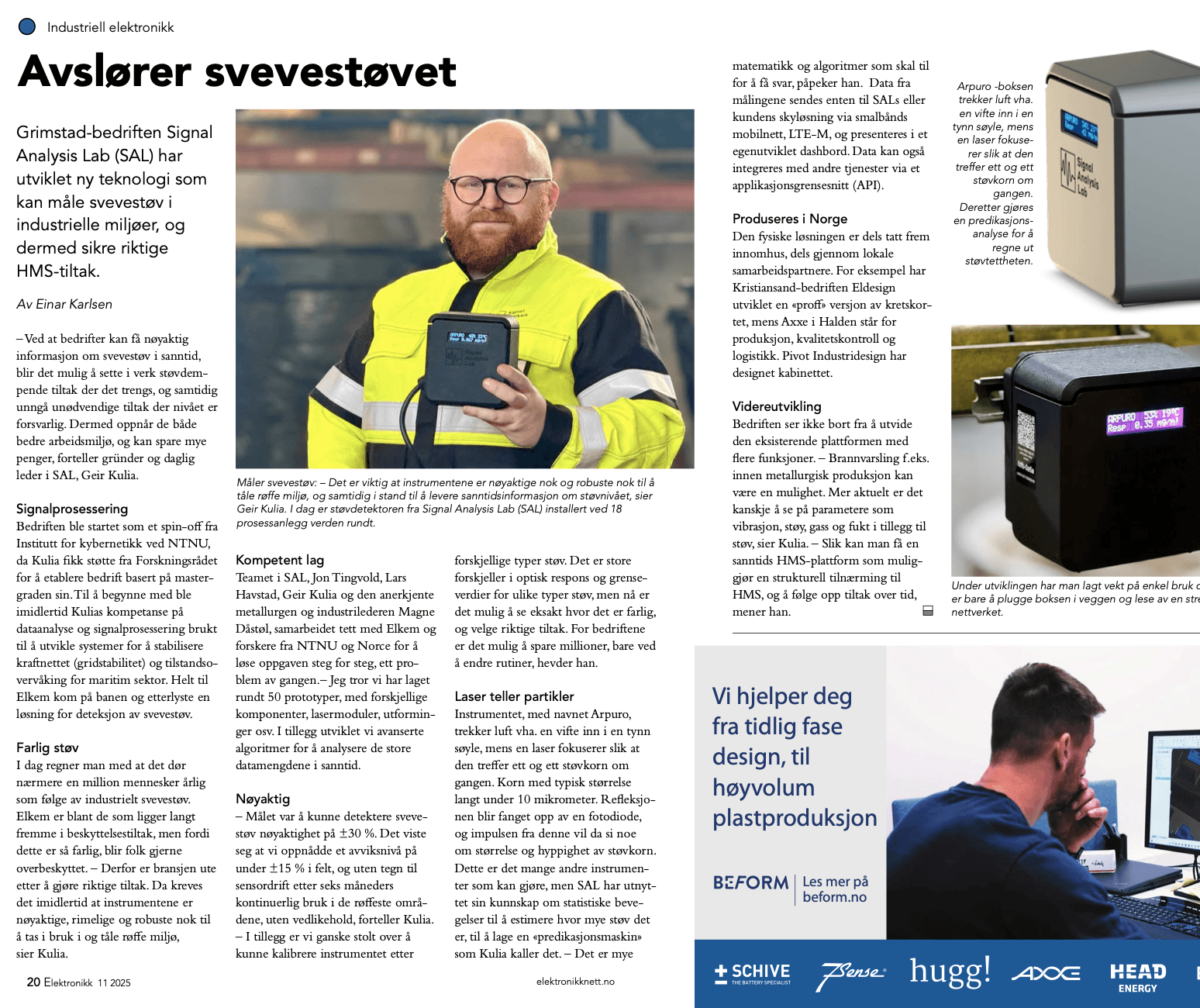 Elektronikknett featured Signal Analysis Lab's development of the Arpuro system for measuring airborne dust in industrial environments. The article highlights how the instrument achieves ±15% accuracy without sensor drift after six months of continuous use in harsh conditions, and can be calibrated for different dust types.