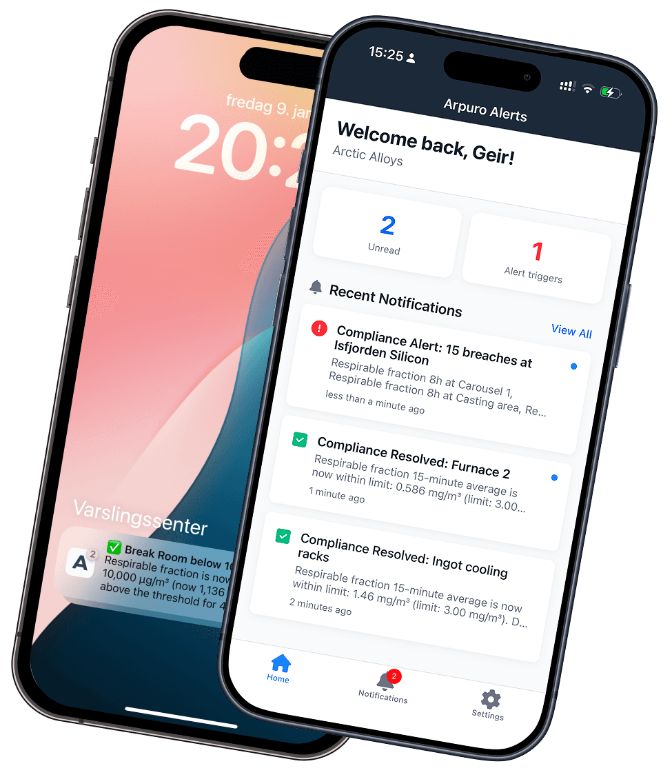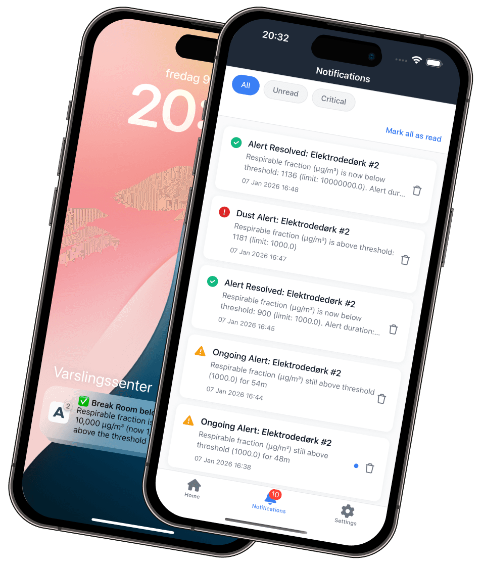 Bli varslet straks konsentrasjonene overskrider dine terskelverdier. Grensen overskredet, nærmer seg advarselsnivåer, og tilbake til normalt — alt levert som pushvarsler i sanntid.